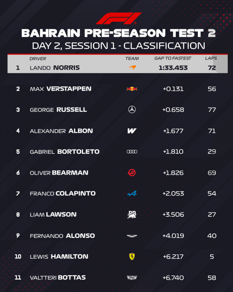 Max eindigt dus als tweede op een tiende achter Norris, na een productieve ochtend. Na de middagpauze zal Verstappen het testwerk hervatten. Tijdens de laatste testdag in aanloop naar het seizoen, zal Isack Hadjar morgen de dag aanvangen, waarna Max het stuurtje vrijdagmiddag overneemt.